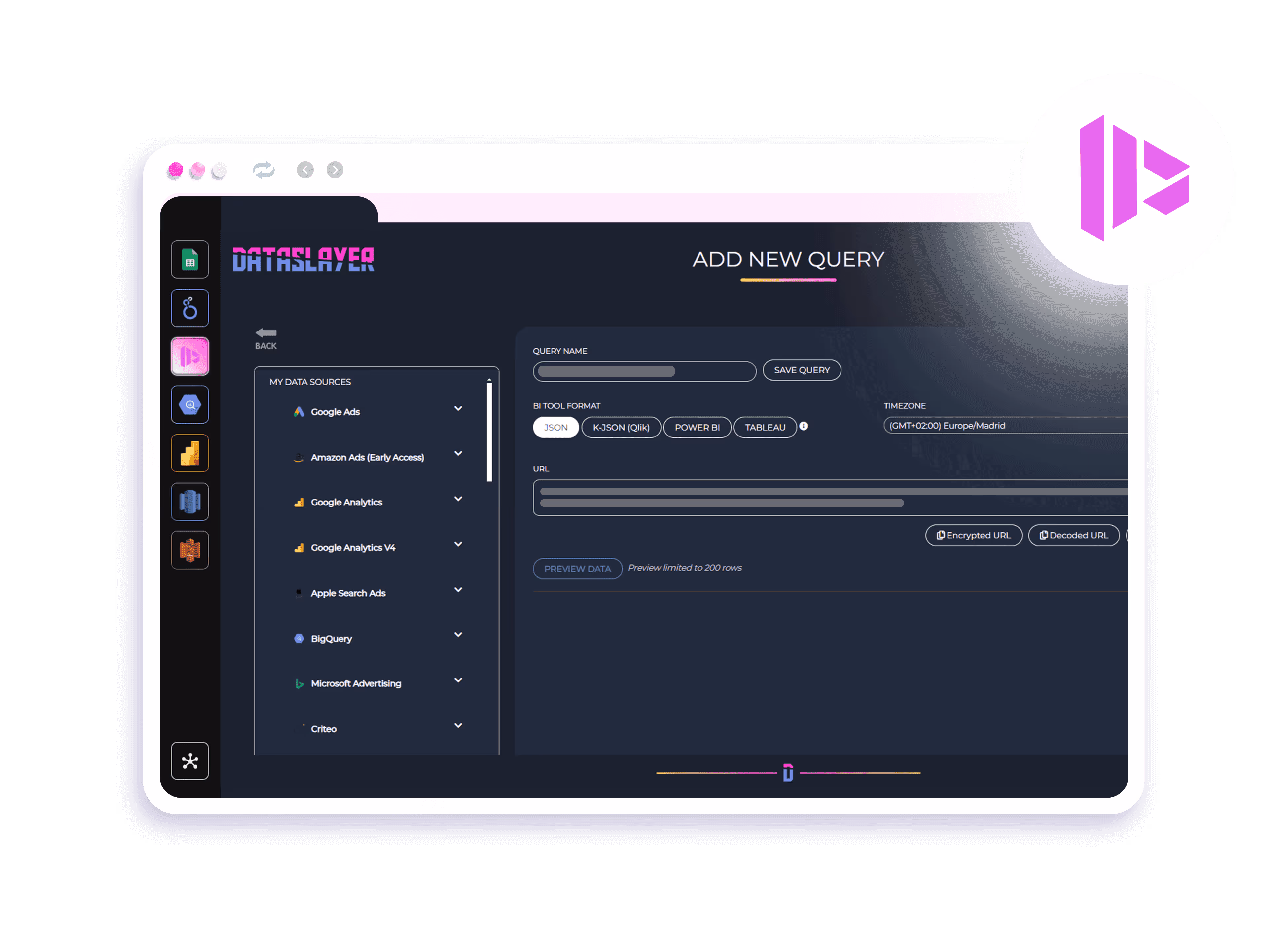 The Dataslayer API gives you the possibility to bring data from multiple sources to the data visualization tool of your choice. Extract clean data from your marketing platforms and store them into your go-to data visualization or BI tool!