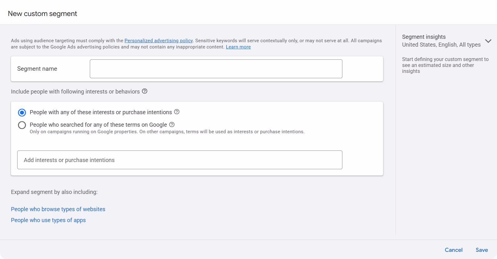 Go to Google Ads, Tools & Settings, Audience Manager, Custom Segments, create new segment.
