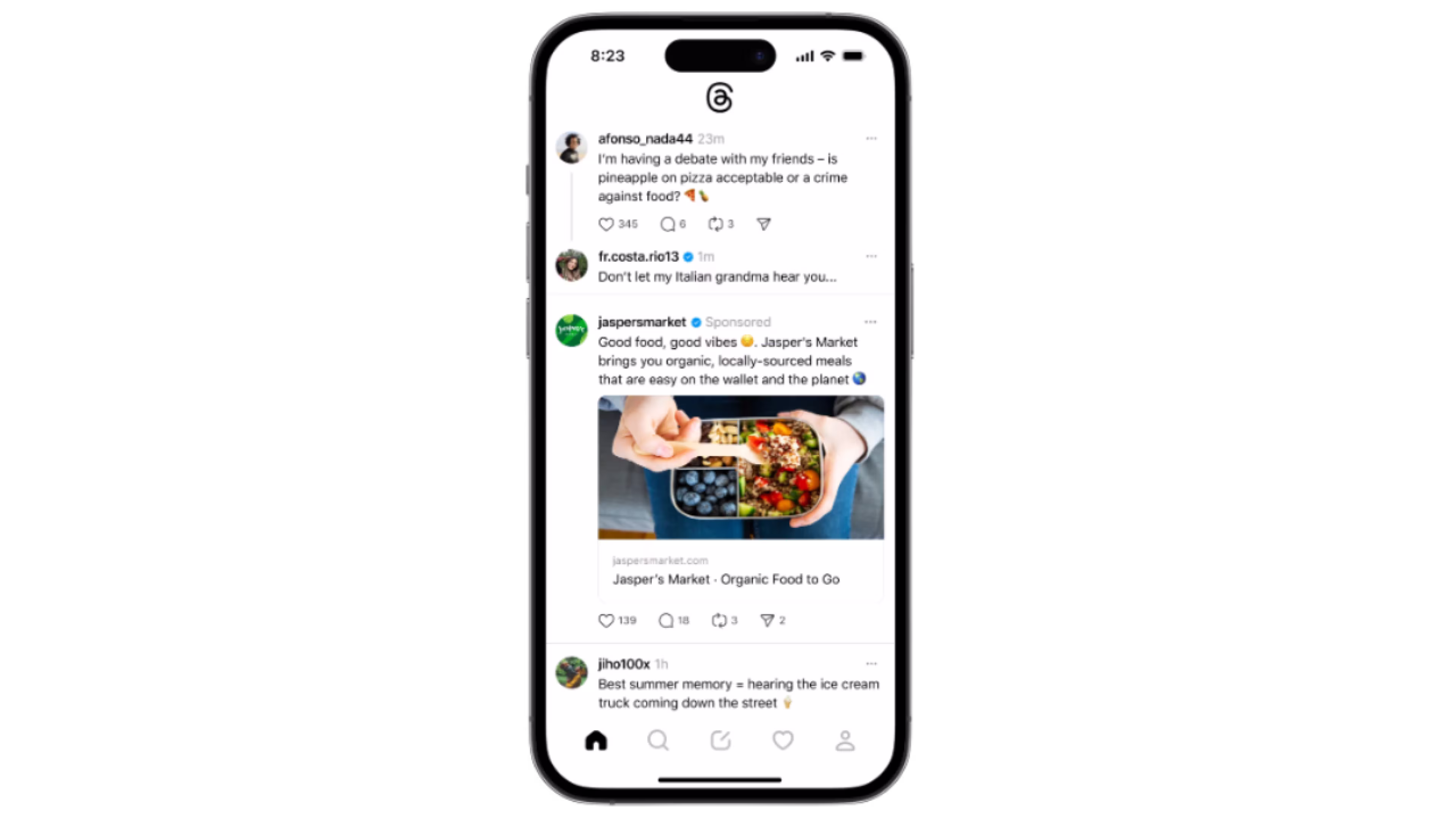 Los anuncios de Threads aparecen entre publicaciones orgánicas en el feed principal. A diferencia de las Historias de Instagram o Facebook Watch, no hay una "sección de anuncios" separada: tu contenido se encuentra en el mismo desplazamiento vertical que las publicaciones regulares.