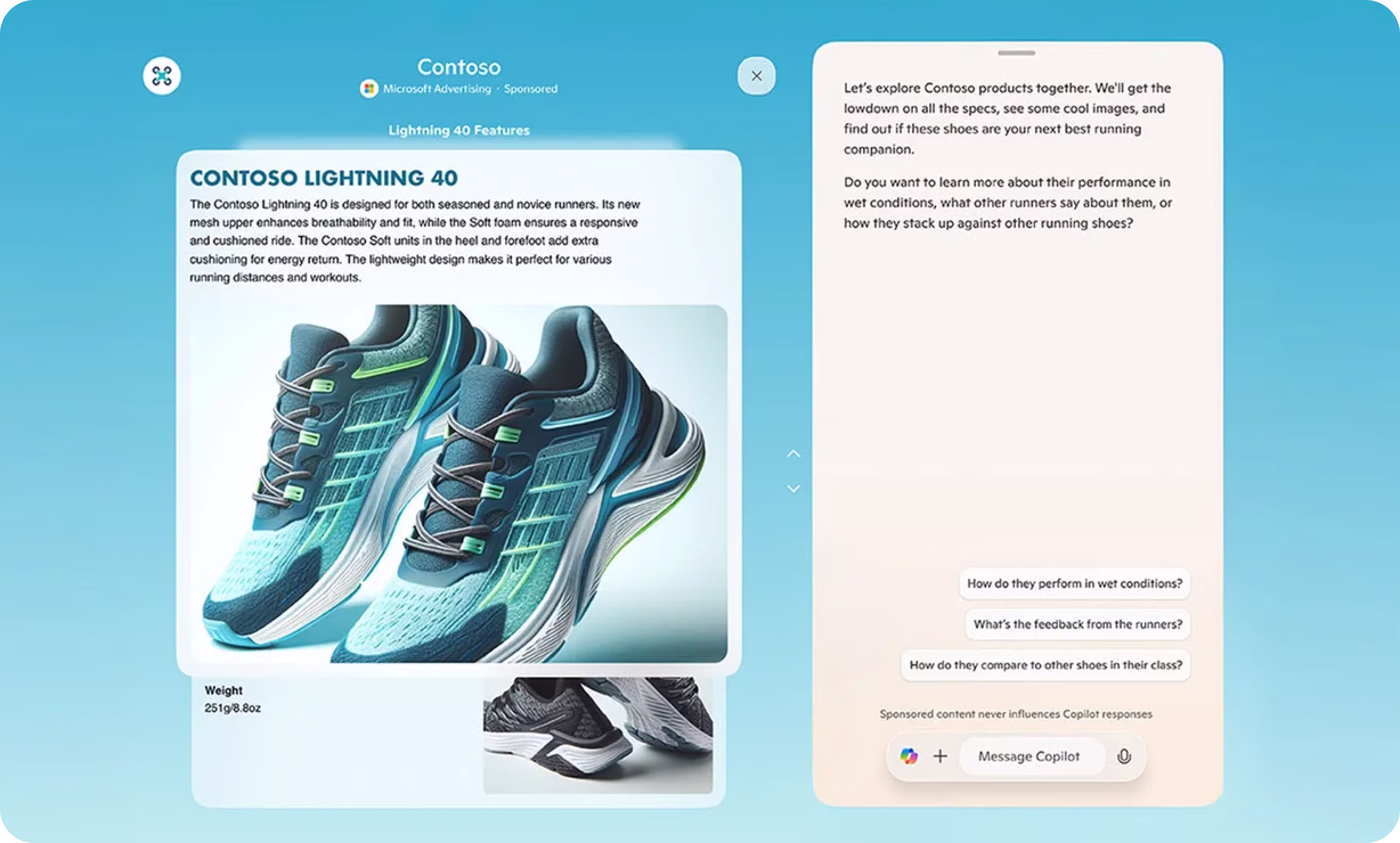 Tu publicidad con Microsoft Copilot no solo se muestra en la búsqueda tradicional de Bing. Los anuncios aparecen directamente dentro de las conversaciones de Copilot.