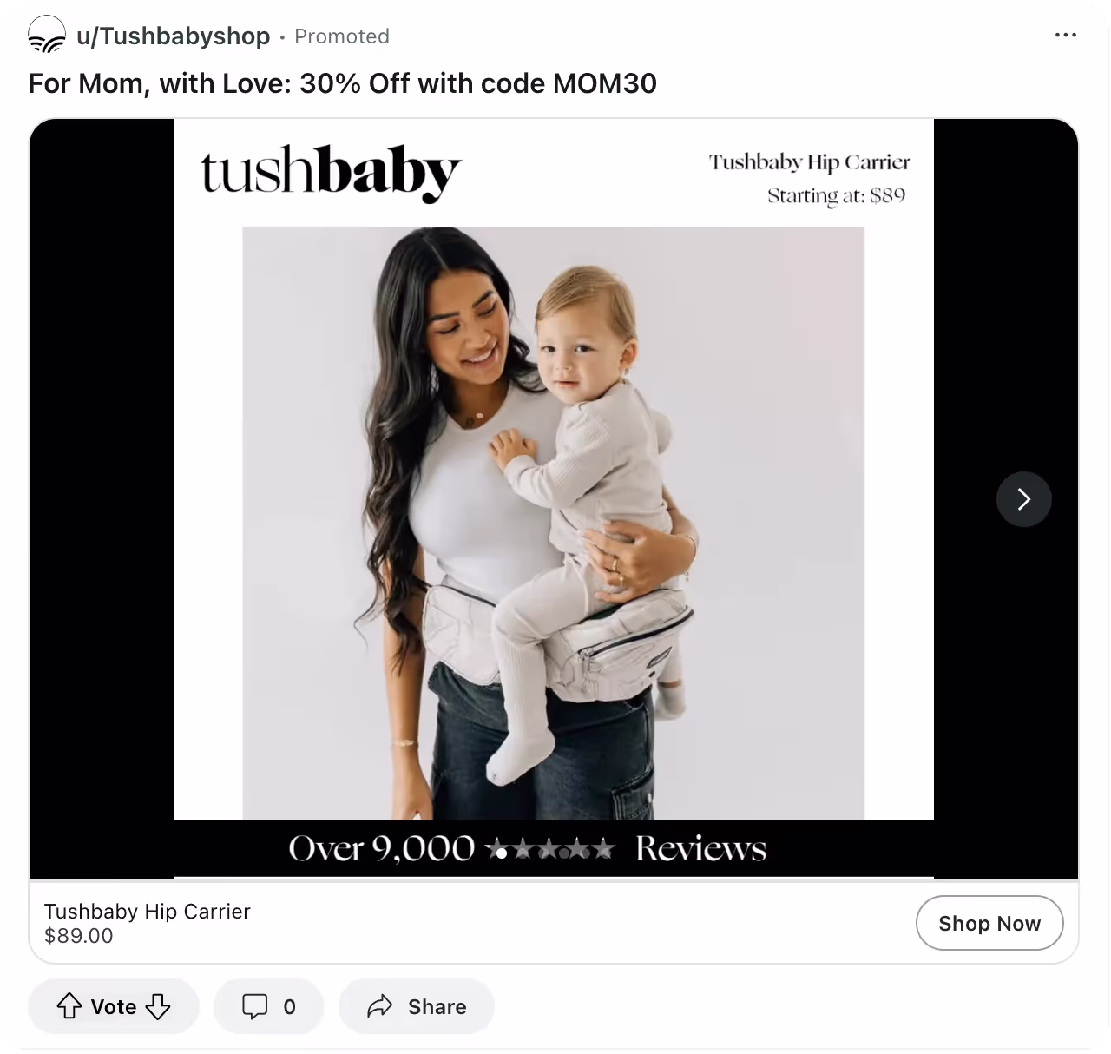 La diferencia clave es que los anuncios aparecen como publicaciones «promocionadas» en los feeds y tienen un aspecto casi idéntico al del contenido orgánico. Los usuarios pueden votar a favor, en contra y comentar tus anuncios. Esta transparencia significa que tu creatividad debe ofrecer un valor auténtico y no contenido promocional.