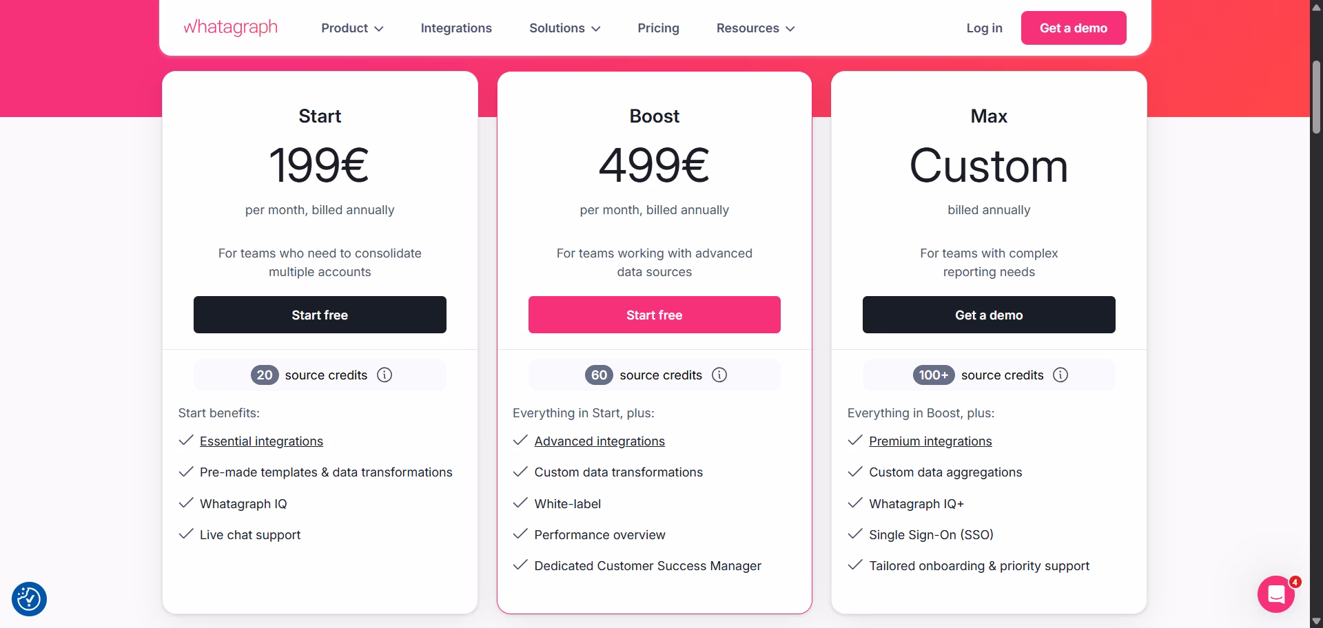 Whatagraph utiliza un modelo de precios basado en el crédito: 1 crédito = 1 cuenta conectada. De acuerdo con Página de precios de Whatagraph, sus planes van desde 199 €/mes (20 créditos) hasta precios personalizados para más de 100 créditos.