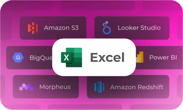 El Conector de Microsoft Excel se integra con múltiples destinos. Puede enviar sus datos de Excel a Hojas de Cálculo de Google para colaboración, a Power BI para visualización avanzada o a BigQuery, Snowflake, Amazon Redshift o Amazon S3 para análisis y almacenamiento a gran escala. También puede conectar los datos de Excel a otro libro de Excel para enriquecer o consolidar los informes.