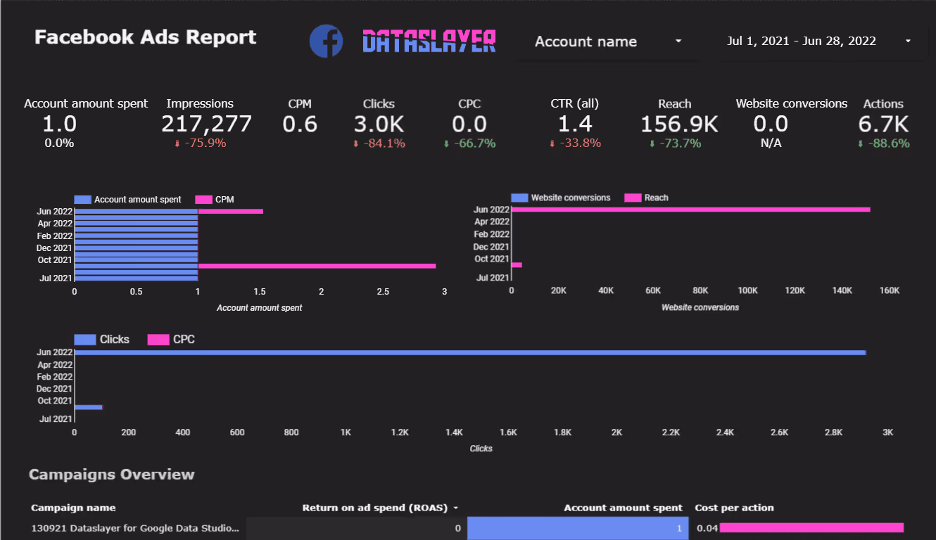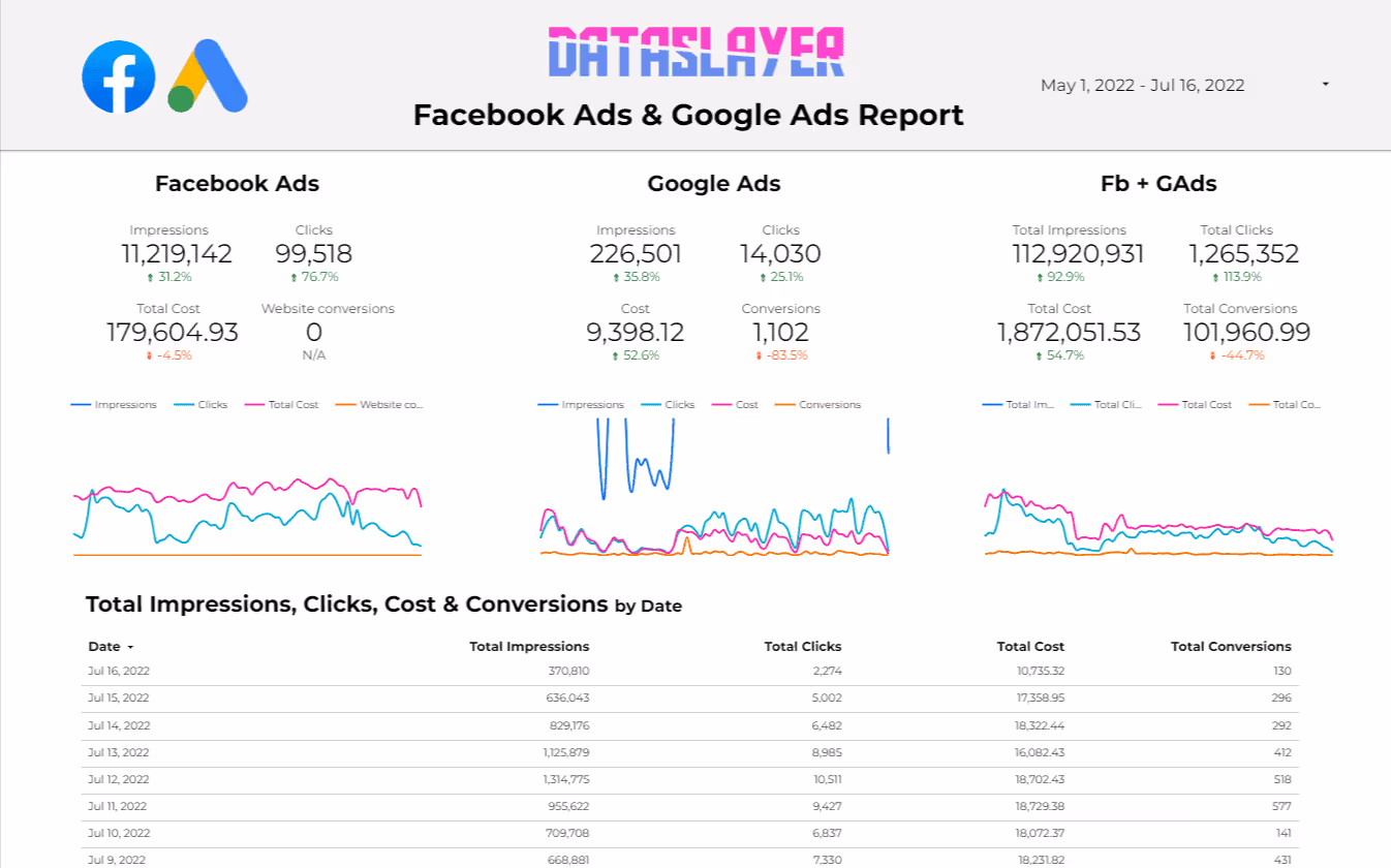 ¡Analiza los datos de tus campañas de Facebook Ads y Google Ads en unos segundos con esta increíble plantilla! Fuentes de datos: Facebook Ads y Google Ads