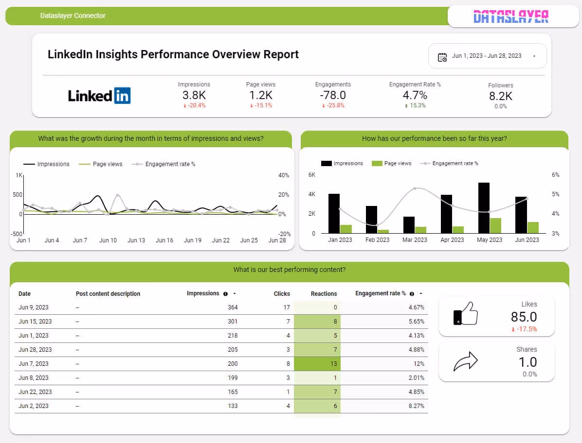 ¡Obtén una visión general rápida del rendimiento de su página de LinkedIn con este informe! Idioma: inglés (modificable). Fuente de datos: páginas de LinkedIn.