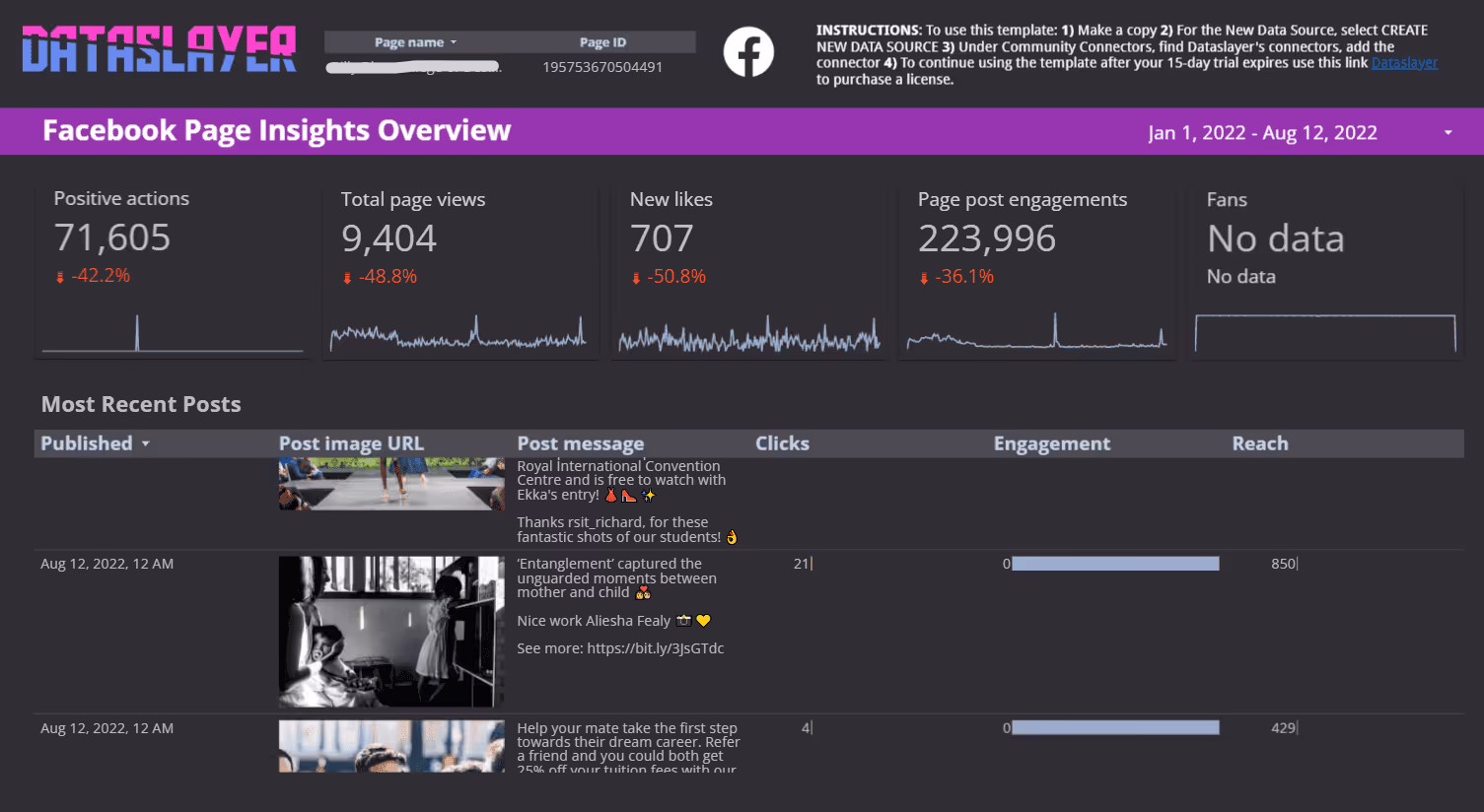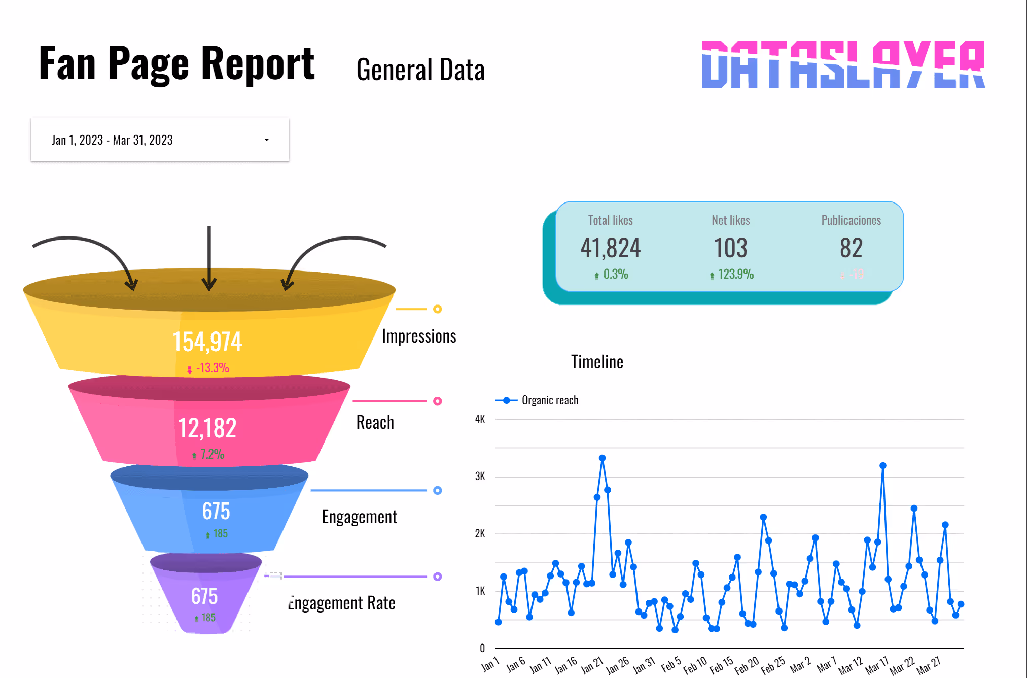 ¡Obtén una visión general rápida de las estadísticas de tu página y publicaciones de Facebook! Idioma: español (modificable) Fuente de datos: Facebook Insights