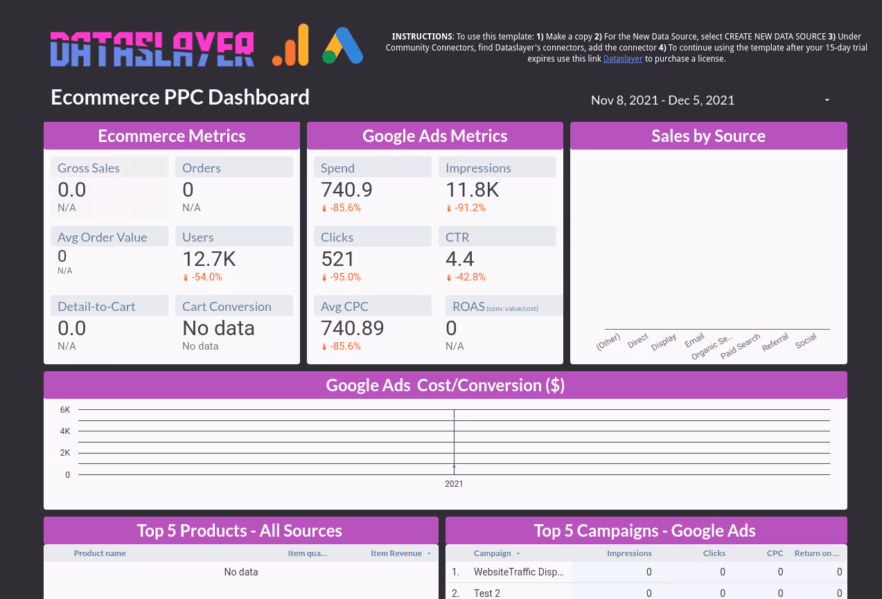 Realiza un seguimiento del rendimiento de tus campañas de comercio electrónico con esta plantilla de panel de control detallada. Fuentes de datos: Google Analytics y Google Ads